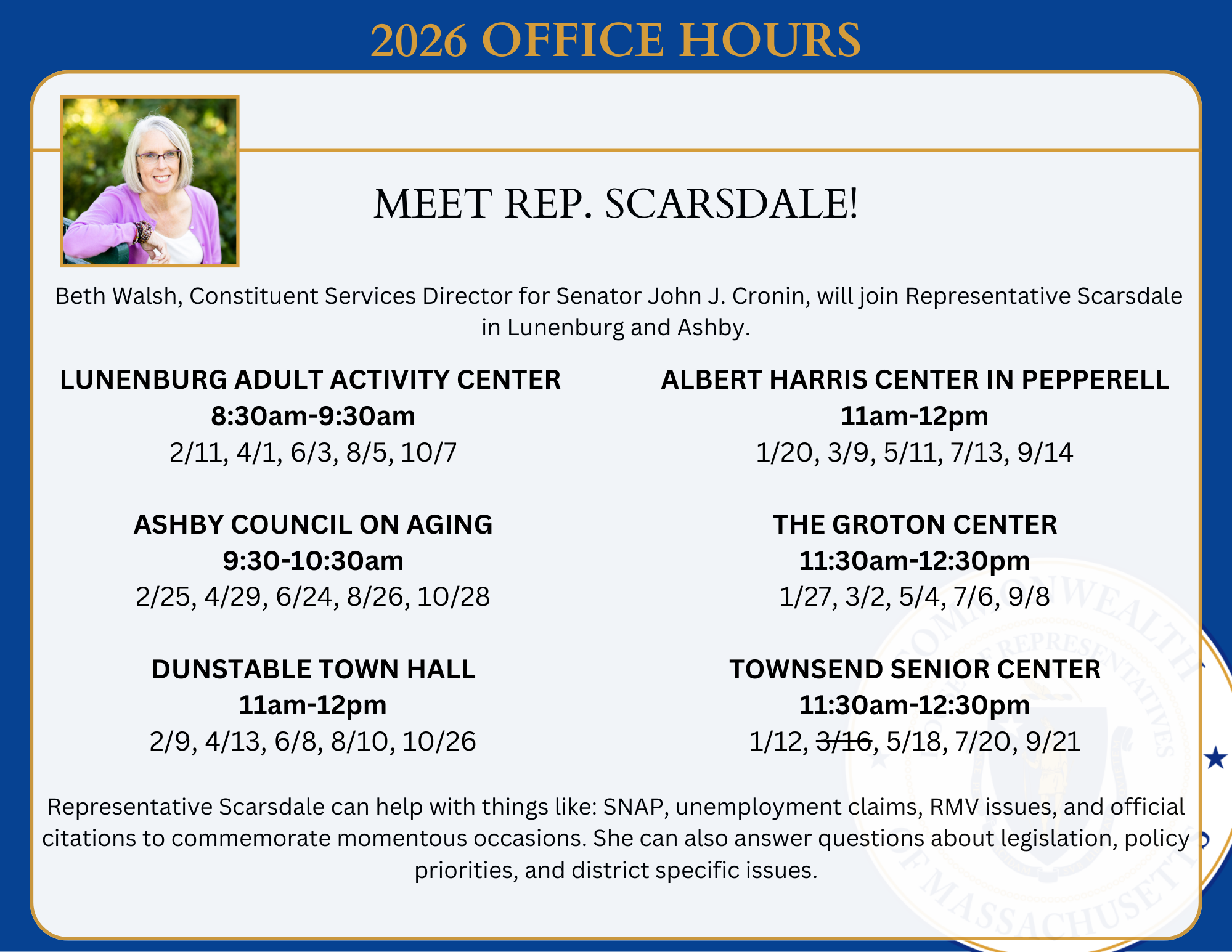 Representative Margaret Scarsdale will be meeting with constituents during office hours in the district in 2026. No appointment is required, but if you wish to discuss a specific bill please email Margaret.Scarsdale@mahouse.gov with any relevant materials so the Representative can prepare ahead of time.
